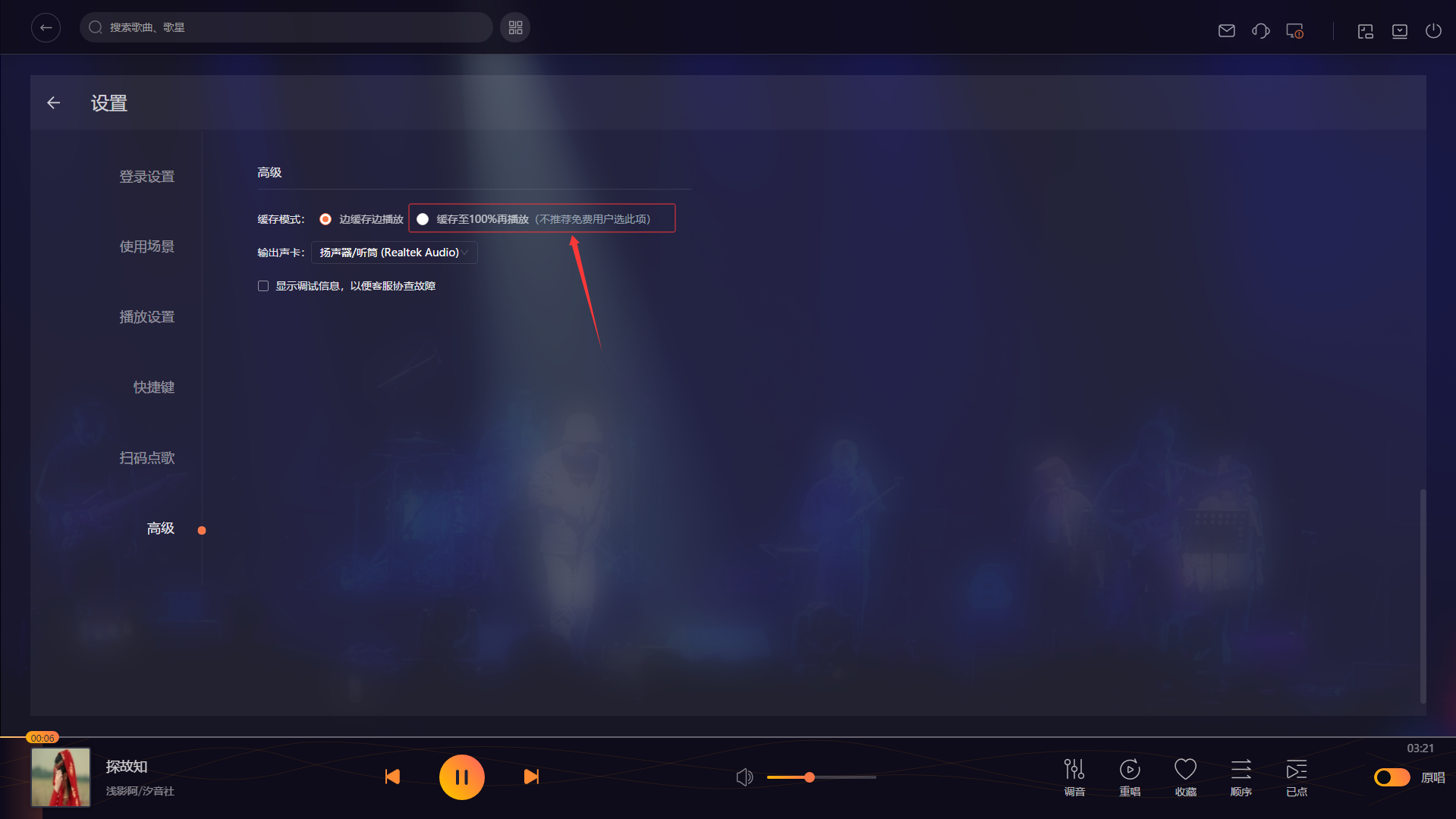 i歌霸,作为在线K歌软件,提供了两种歌曲缓存模式:边缓存边播放、缓存到100%再播放。前者体验最佳,但是需要稳定、足够的网络支持;后者体验次之,但能够支持较差的网络环境。