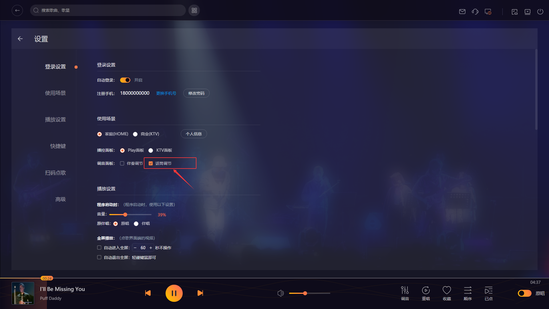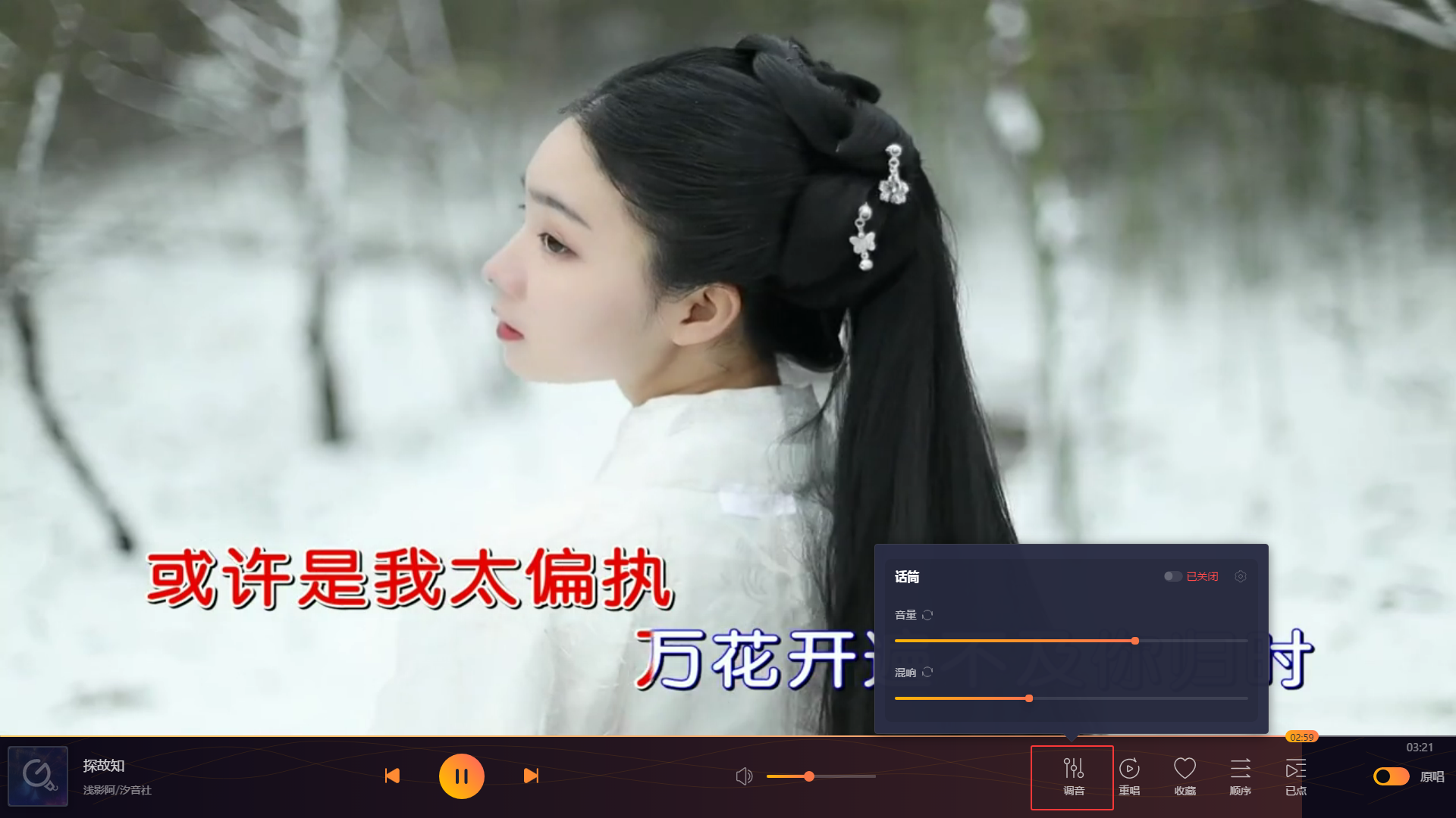然后,点击页面底部播控栏的“调音”按钮,接可操作话筒了;包括:话筒的开关、话筒音量调节、混响调节。